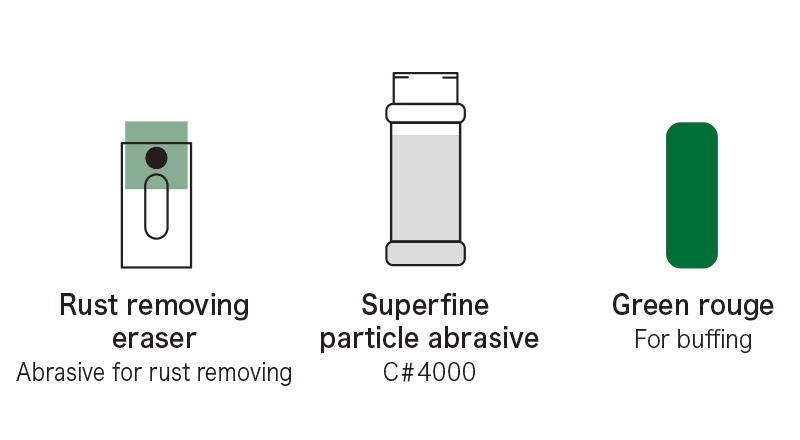 - Using the eraser whetstone and sandpaper, remove rust and tarnish, then buff with the polisher to finish