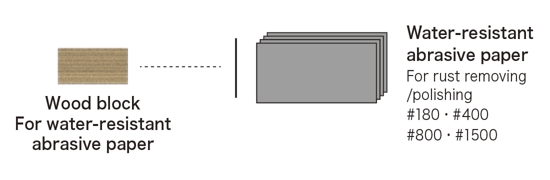 Use water-resistant abrasive paper #180 for persistent rust. Start with #400 paper after using rust removing eraser. For better finish, polish off scratches by using finer water-resistant abrasive paper by stages to #1500.